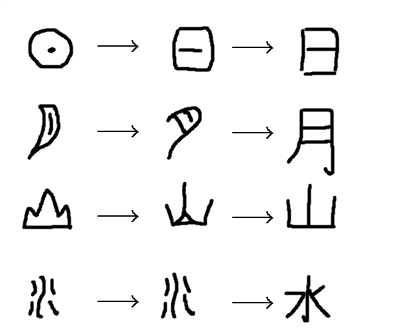 En esta imagen se ve la evolución histórica de cuatro caracteres sencillos, con los significados de sol, luna, montañas y agua desde las formas más arcaicas de la columna izquierda hasta las formas actuales de la columna derecha.